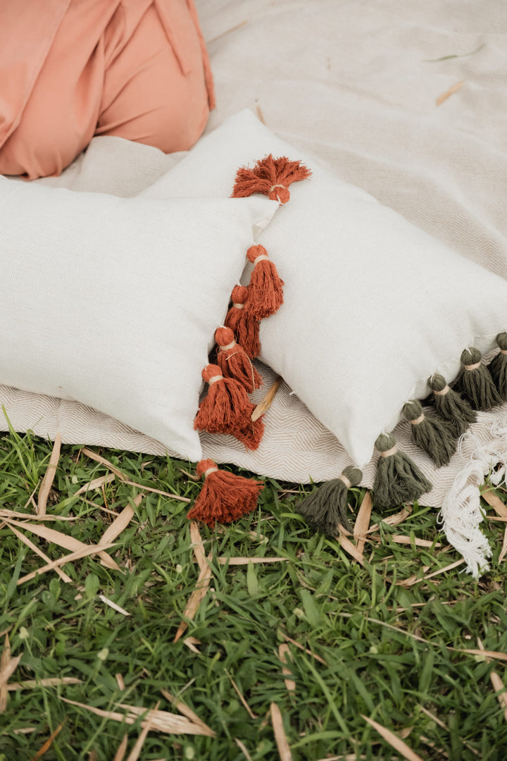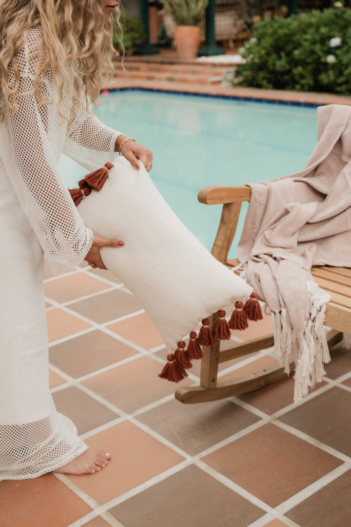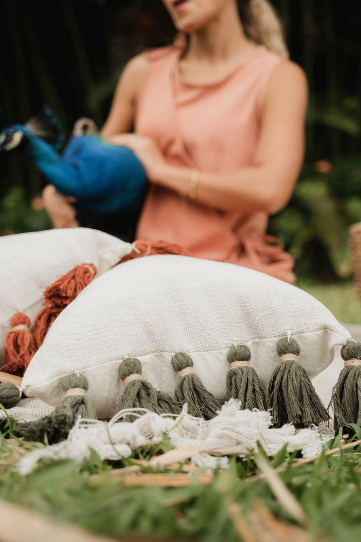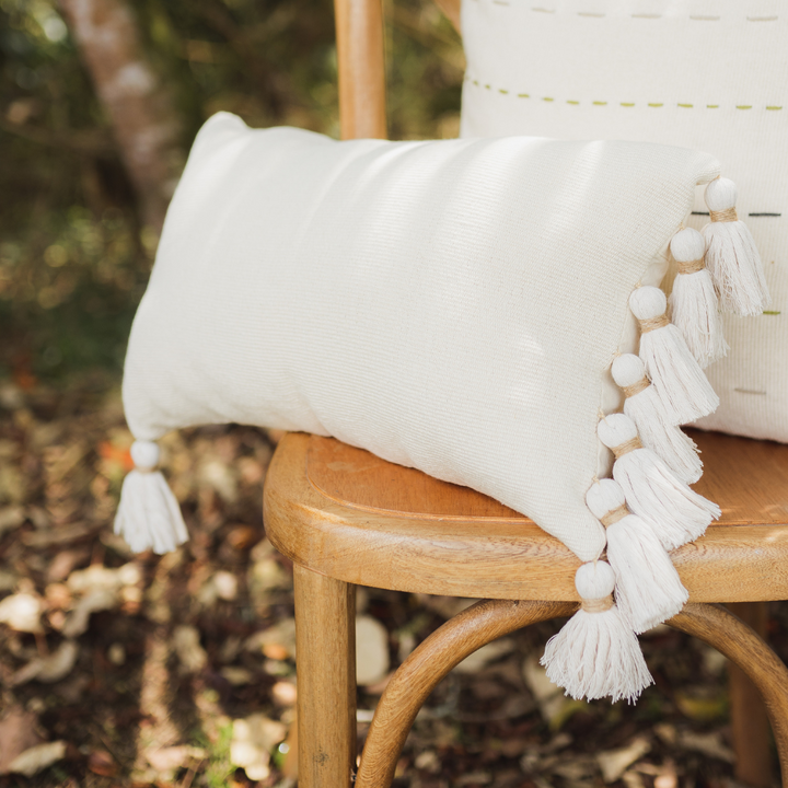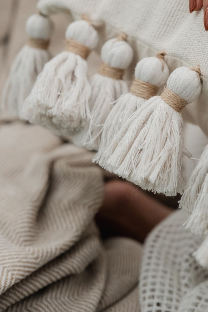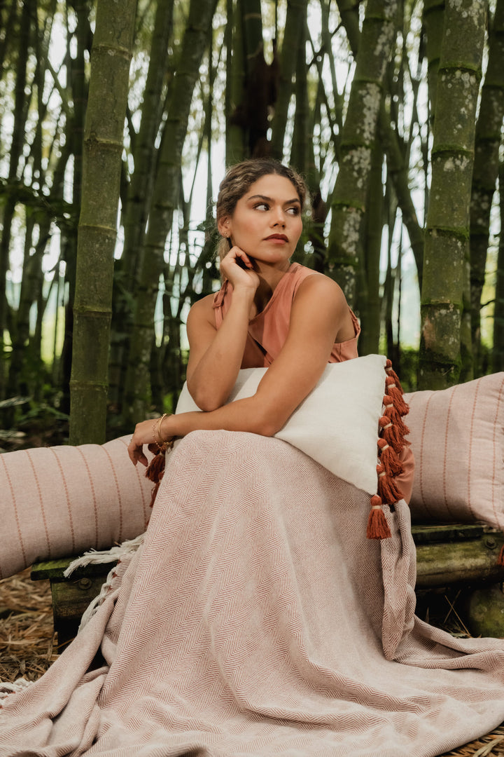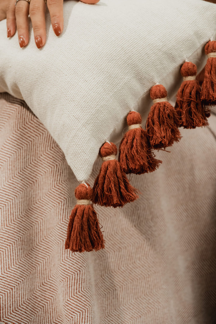 Confeccionado en algodón y terminado con borlas de hilaza en los laterales.