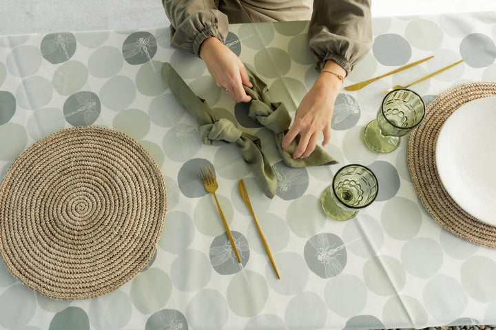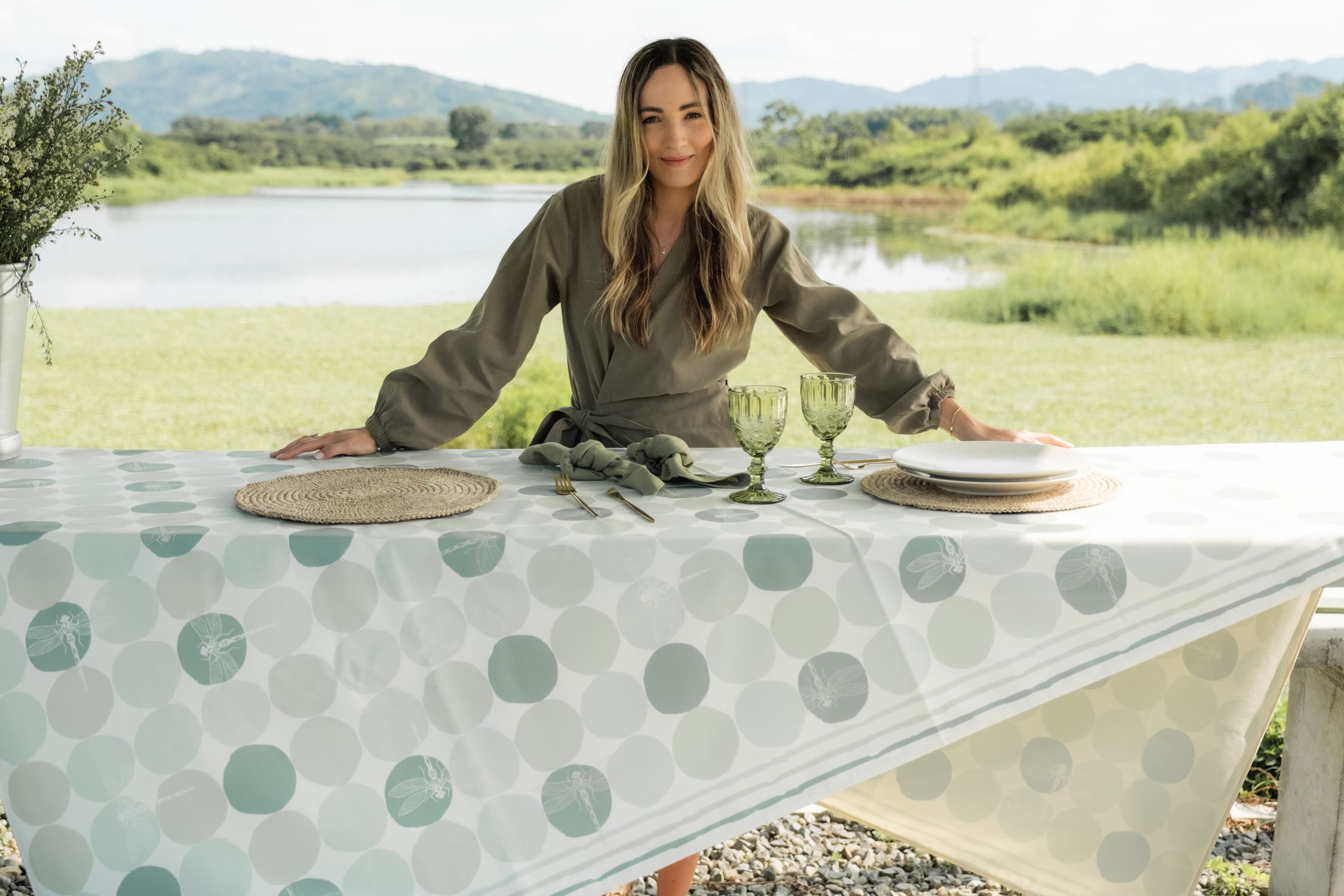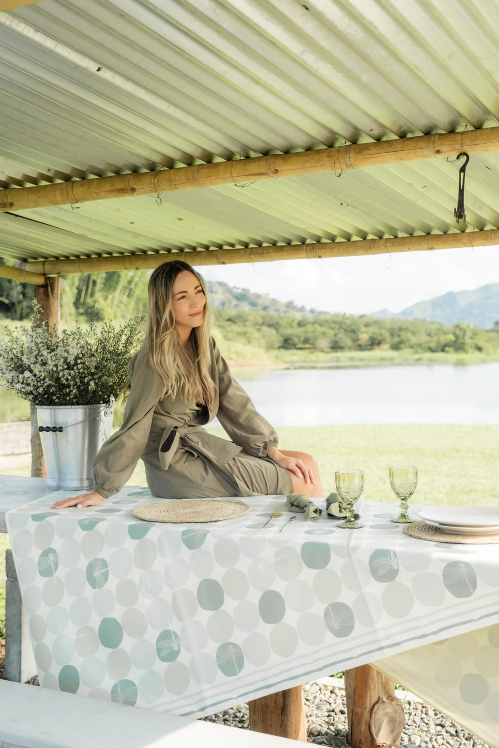 Mantel en Tejido Plano – Estilo Natural y Protección Antiderrames, Antifluídos. Confeccionado en poliéster con recubrimiento de Scothc Grad. Incluye borlas removibles en las esquinas.