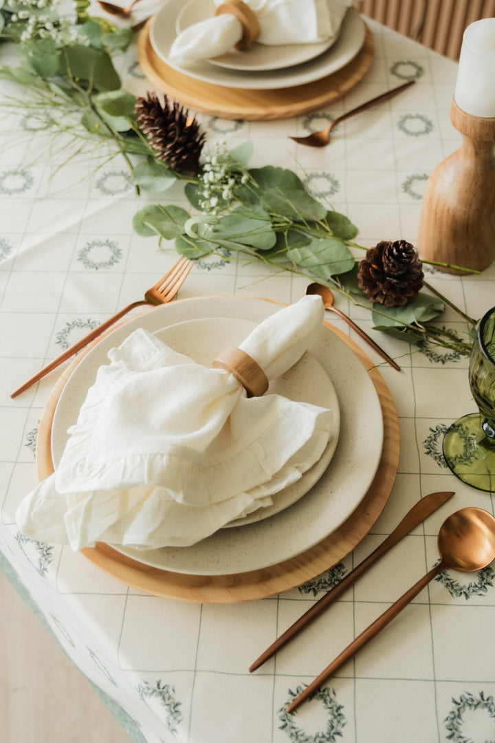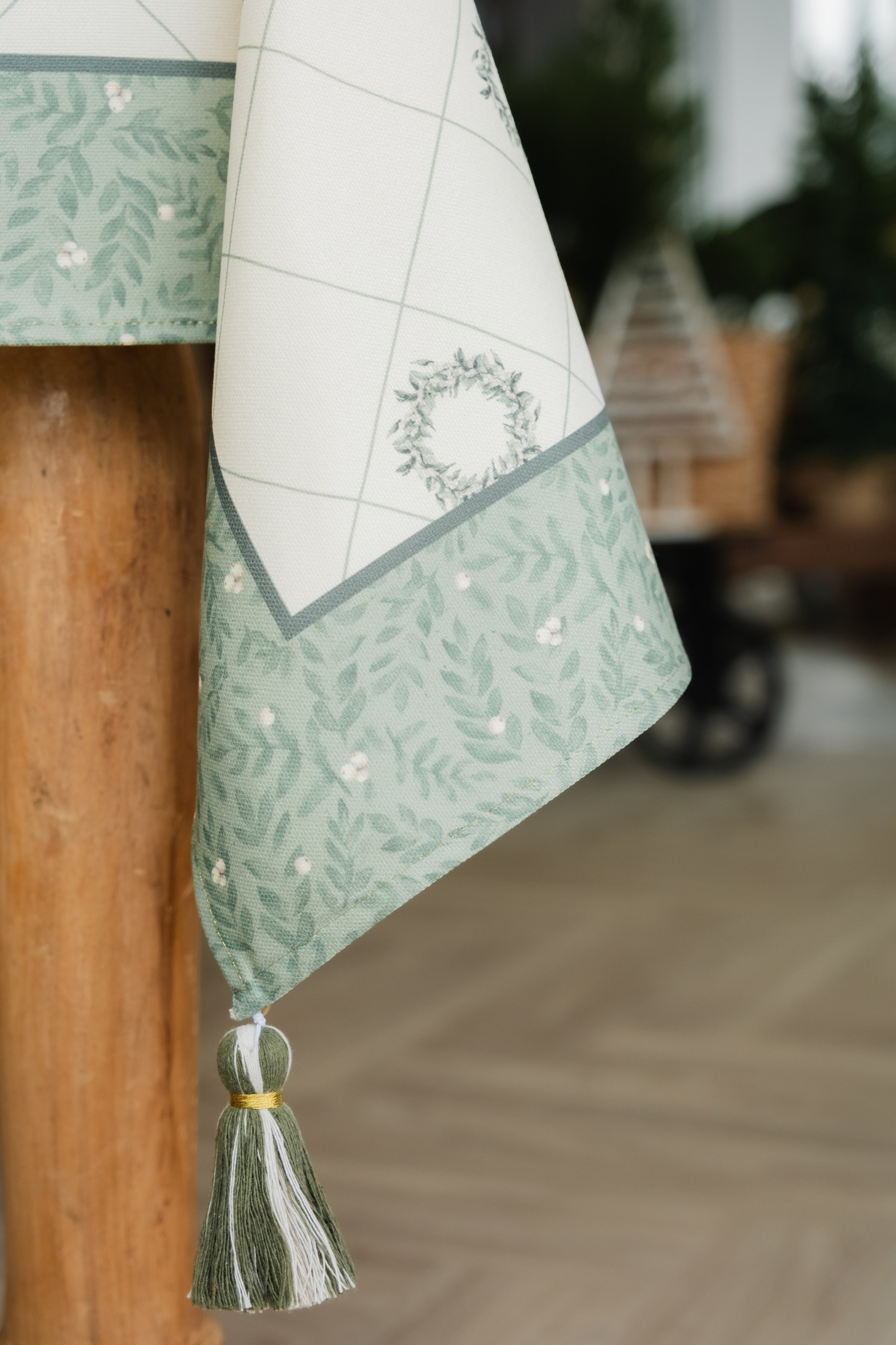 Mantel en Tejido Plano – Estilo Natural y Protección Antiderrames, Antifluídos. Confeccionado en poliéster con recubrimiento de Scothcgard. Incluye borlas removibles en las esquinas.