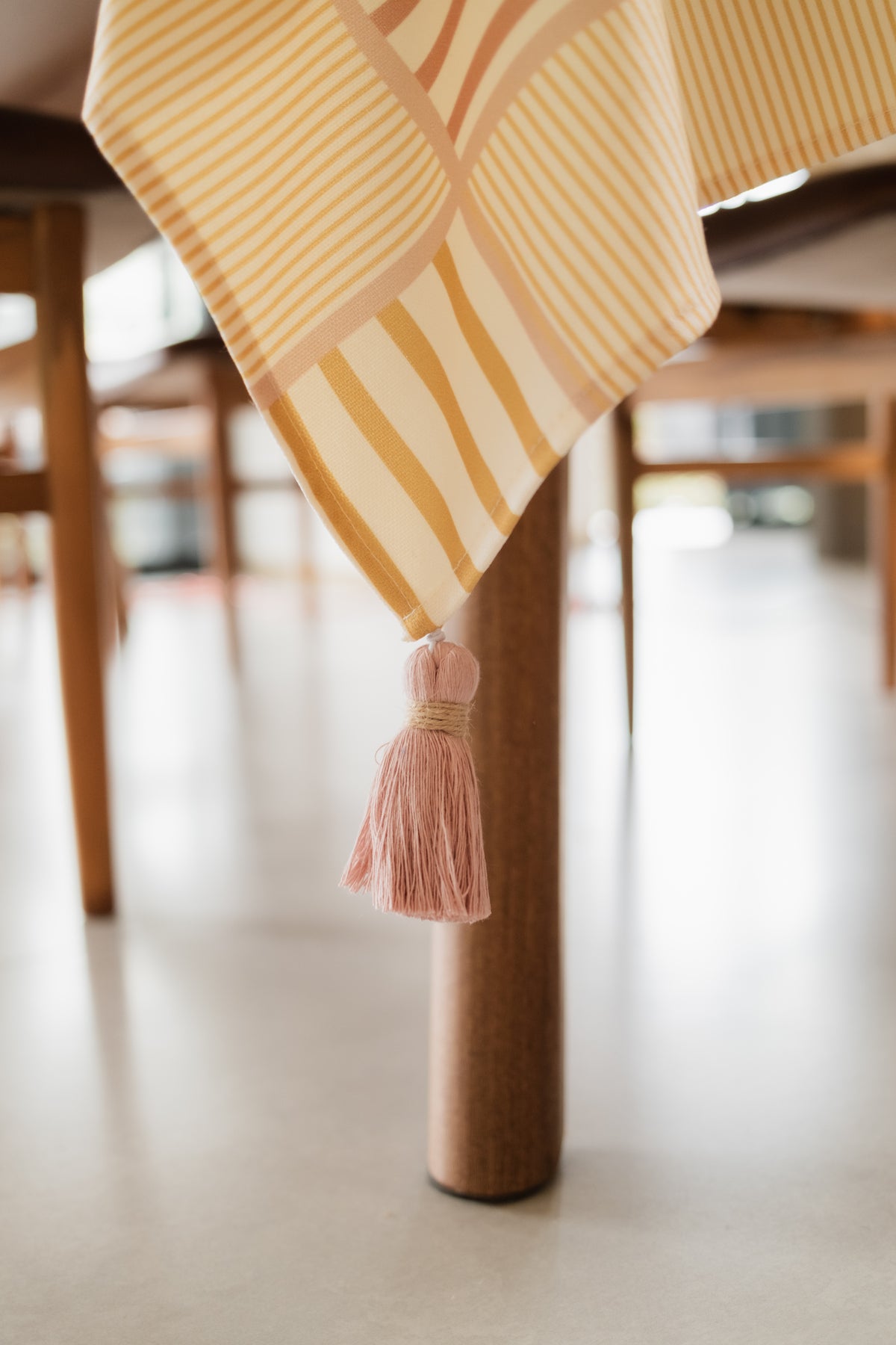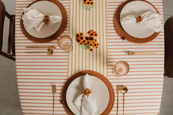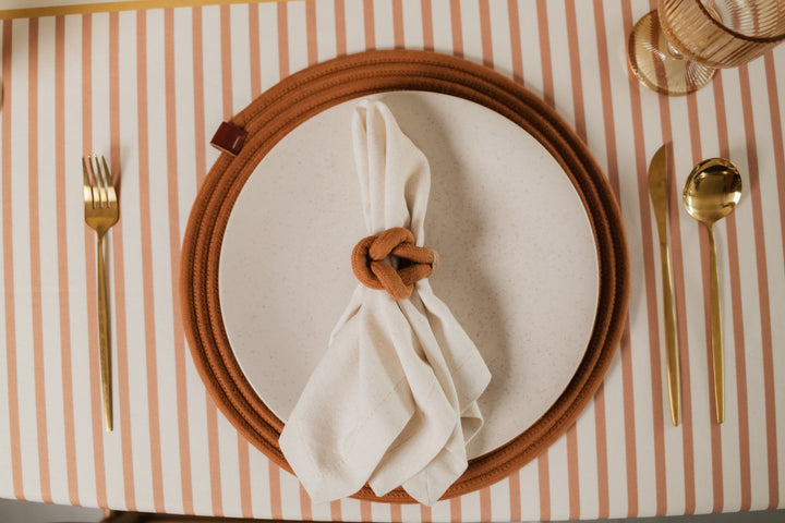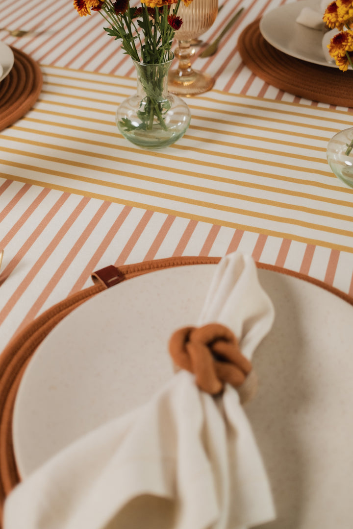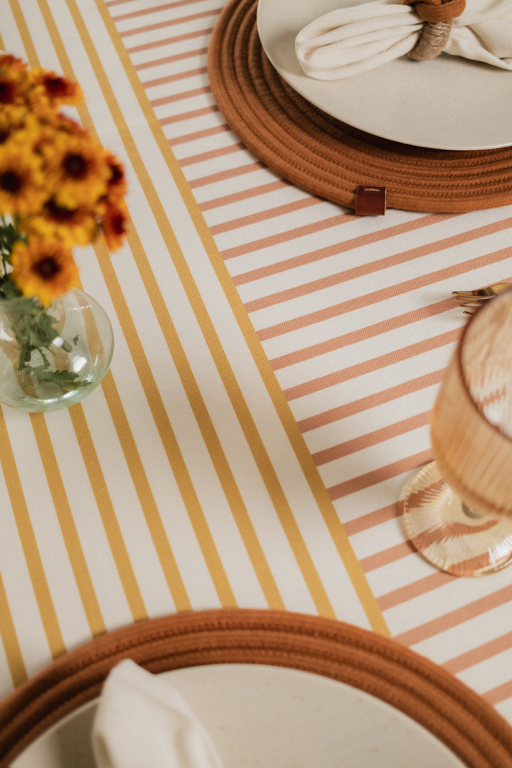 Mantel en Tejido Plano – Estilo Natural y Protección Antiderrames, Antifluídos. Confeccionado en poliéster con recubrimiento de Scothcgard. Incluye borlas removibles en las esquinas.